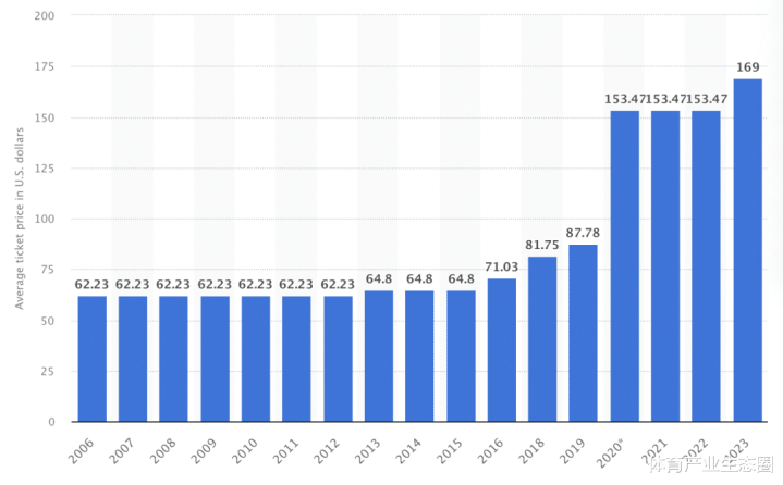 2019年,搬家前的最后一个赛季,突袭者主场比赛的平均票价约为87.78美元,在全联盟排名倒数第九;而在搬到维加斯后,突袭者平均票价迎来成倍增长,今年已经飙升至239.23美元,稳居联盟前三。