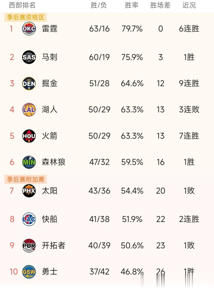 4月8日,西部焦点球队的比赛战况如下:雷霆123-87大胜湖人,火箭119-105逆转射落太阳,快船116-103轻取独行侠,勇士110-105险胜国王,森林狼 124-104击败步行者。