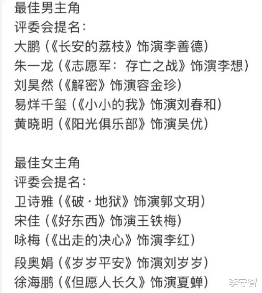 名单公布后,很多人都说爆冷,但其实即便没有特别重量级的男女演员入围,但男演员的竞争也算激烈,大鹏、易烊千玺、朱一龙、刘昊然和黄晓明都有实力名气和胜算。但最佳女主角的提名,除了宋佳和咏梅比较有名有实力,其余几位确实有点意外。