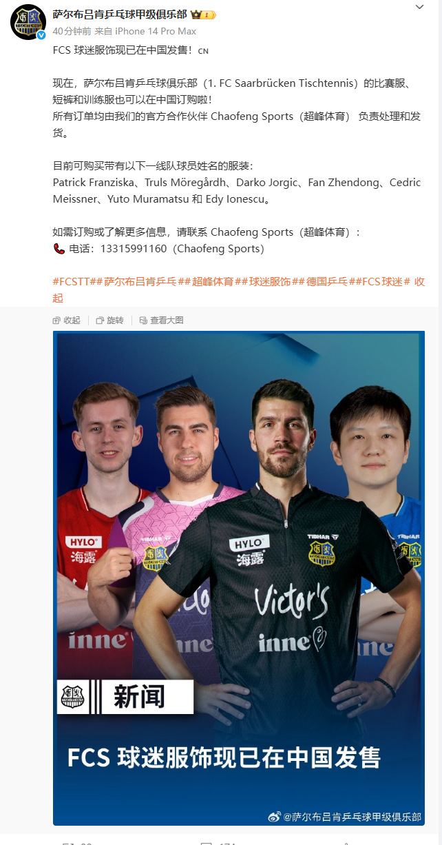 现在,萨尔布吕肯乒乓球俱乐部(1.FCSaarbrückenTischtennis)的比赛服、短裤和训练服也可以在中国订购啦!