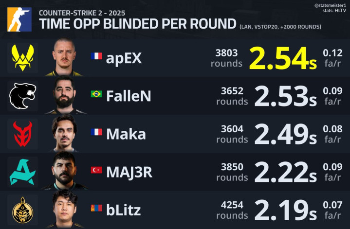 bLitz–平均每回合致盲2.19秒(0.07次闪光助攻/回合,总回合:4254)