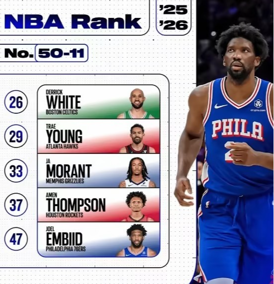 好吧!这些人好歹都是在前十,最惨的就是76人当家球星恩比德了,直接排名第47,要知道去年还第8,今年直接下降了39位。不知道大帝看到这个排名有什么感想?会不会直接开骂?这也太不被看好了。