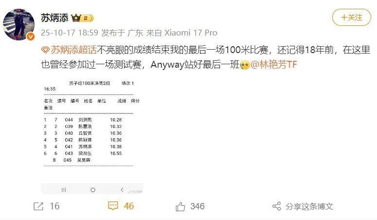 从2006年在香港对抗赛赛场上崭露头角,到2025年十五运会的精彩谢幕,苏炳添兑现了自己“跑到跑不动”为止的诺言。